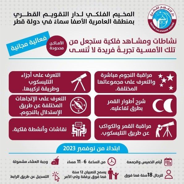 يسر دار التقويم القطري دعوتكم للتسجيل في المخيم الفلكي خلال موسم التخييم، والكائن بمنطقة العامرية الأصفى سماءً في دولة قطر