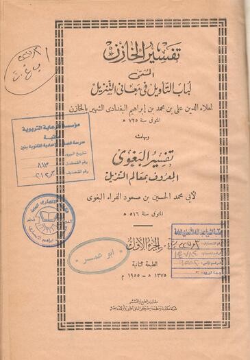 تفسير الخازن المسمى لباب التاويل في معاني التنزيل، وبهامشه تفسير البغوي المعروف بمعالم التنزيل