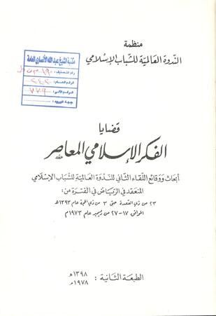 قضايا الفكر الاسلامي المعاصر : وقائع اللقاء الثاني للندوة العالمية للشباب الاسلامي الرياض 23ذي القعدة - 3ذي الحجة 1393هـ الموافق 17-27ديسمبر 1973م